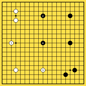 As to f3 rather than j3, it has an element of being a forcing move, so Black might have time to go back to q10. But White might be awkward, and Kudo has chosen this favourite opening so he can stay in control. q10 gives him that control.