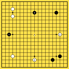 However, if Black plays 7 on the left, assume White plays on the right, Black on the top and White on the lower side, then tengen ("A" in the diagram below) is no longer a sensible big point, so White has got the last big point.