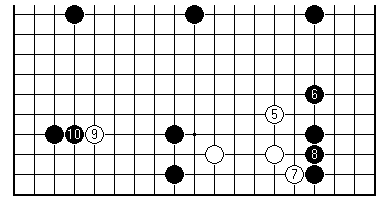 Having done something for the group on the right with 5 and 7, I came in with 9. By professional standards this is an overplay. Black's answer at 10 is interesting, and Sonoda said he understood the thinking behind it. Now White will not be able to pull any stunts in the left-hand corner. The group started by 9 will have to put together some shape without access to the 3-3 point.