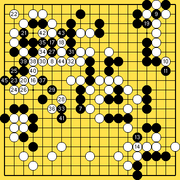46 connects. Black gives up stones for outside influence: in this game it seems that White's stones on the left and lower sides are well placed to counter it.